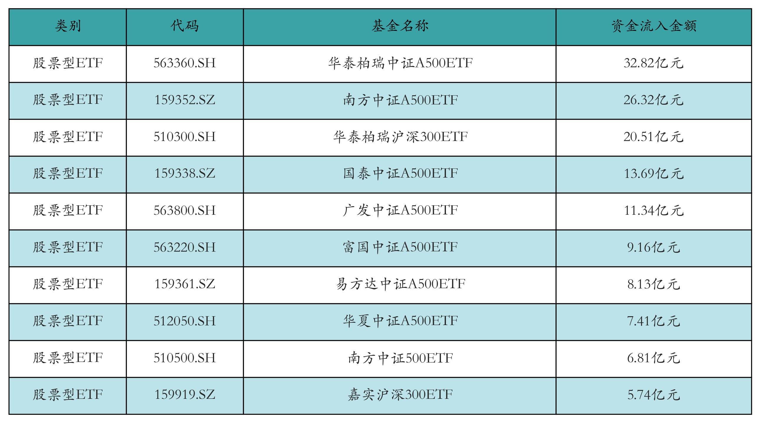 昨日股票型ETF资金流入最多的3只ETF及其流入金额分别为:华泰柏瑞中证A500ETF(流入32.82亿元)、南方中证A500ETF(流入26.32亿元)、华泰柏瑞沪深300ETF(流入20.51亿元)。资金流入前10详情见下表: