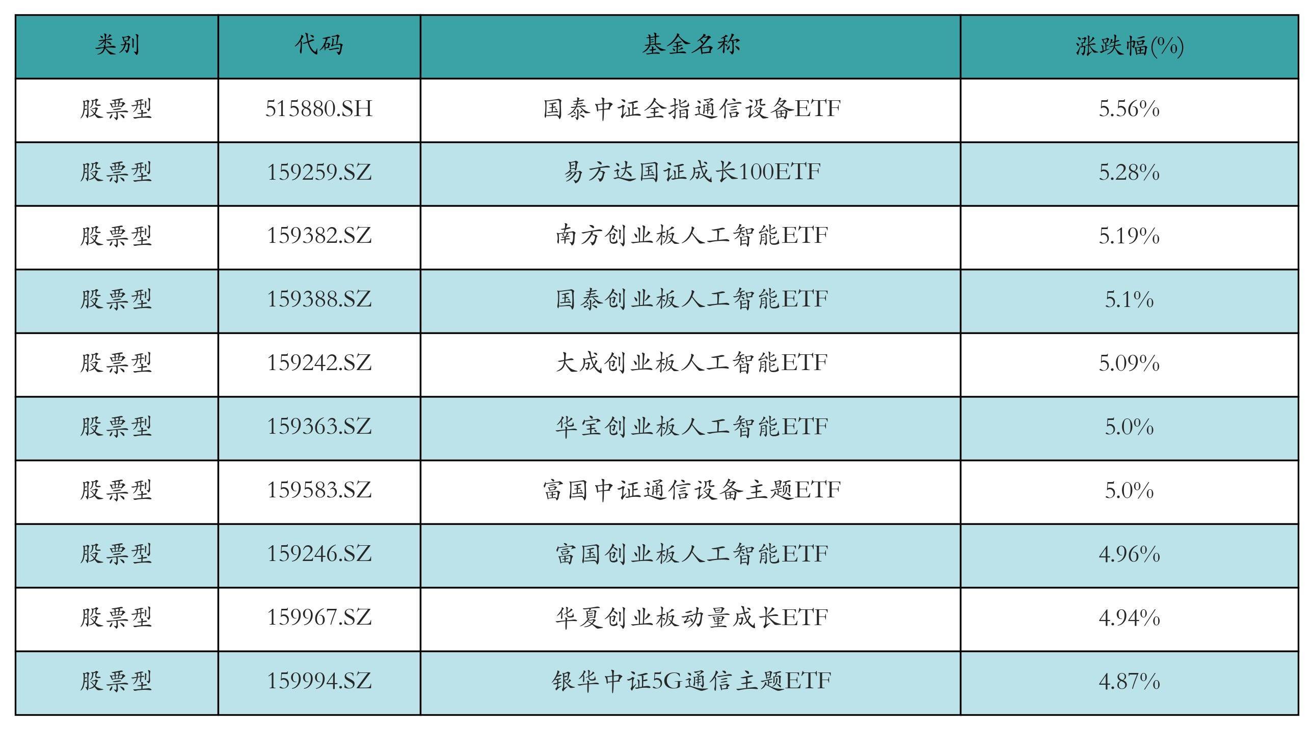 昨日股票型ETF涨幅最高的3只ETF及其收益率分别为:国泰中证全指通信设备ETF(5.56%)、易方达国证成长100ETF(5.28%)、南方创业板人工智能ETF(5.19%)。涨幅前10详情见下表: