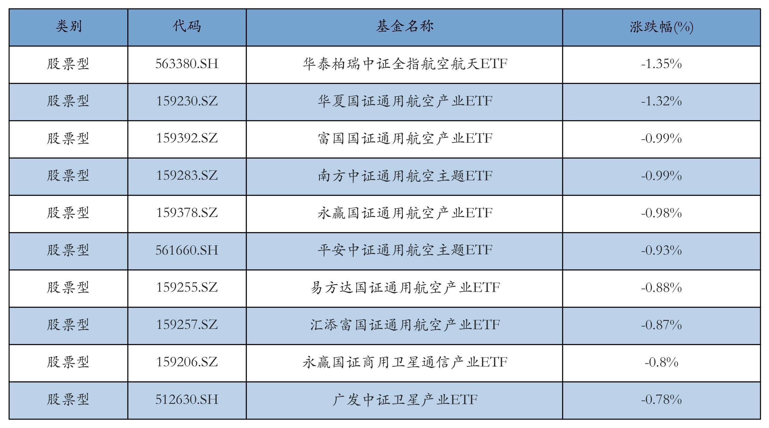 昨日股票型ETF跌幅最大的3只ETF及其收益率分别为:华泰柏瑞中证全指航空航天ETF(-1.35%)、华夏国证通用航空产业ETF(-1.32%)、富国国证通用航空产业ETF(-0.99%)。跌幅前10详情见下表:
