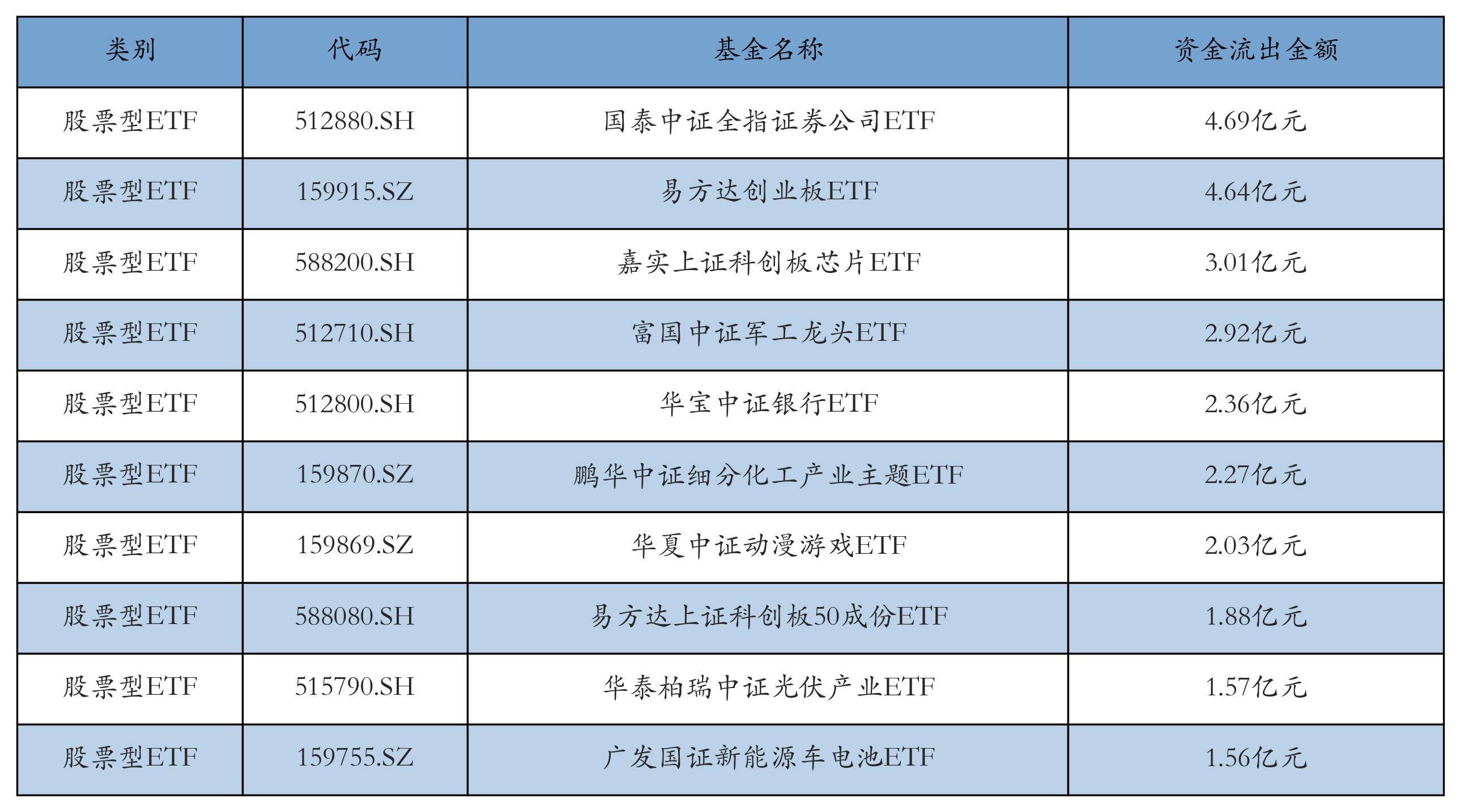 昨日股票型ETF资金流出最多的3只ETF及其流出金额分别为:国泰中证全指证券公司ETF(流出4.69亿元)、易方达创业板ETF(流出4.64亿元)、嘉实上证科创板芯片ETF(流出3.01亿元)。资金流出前10详情见下表: