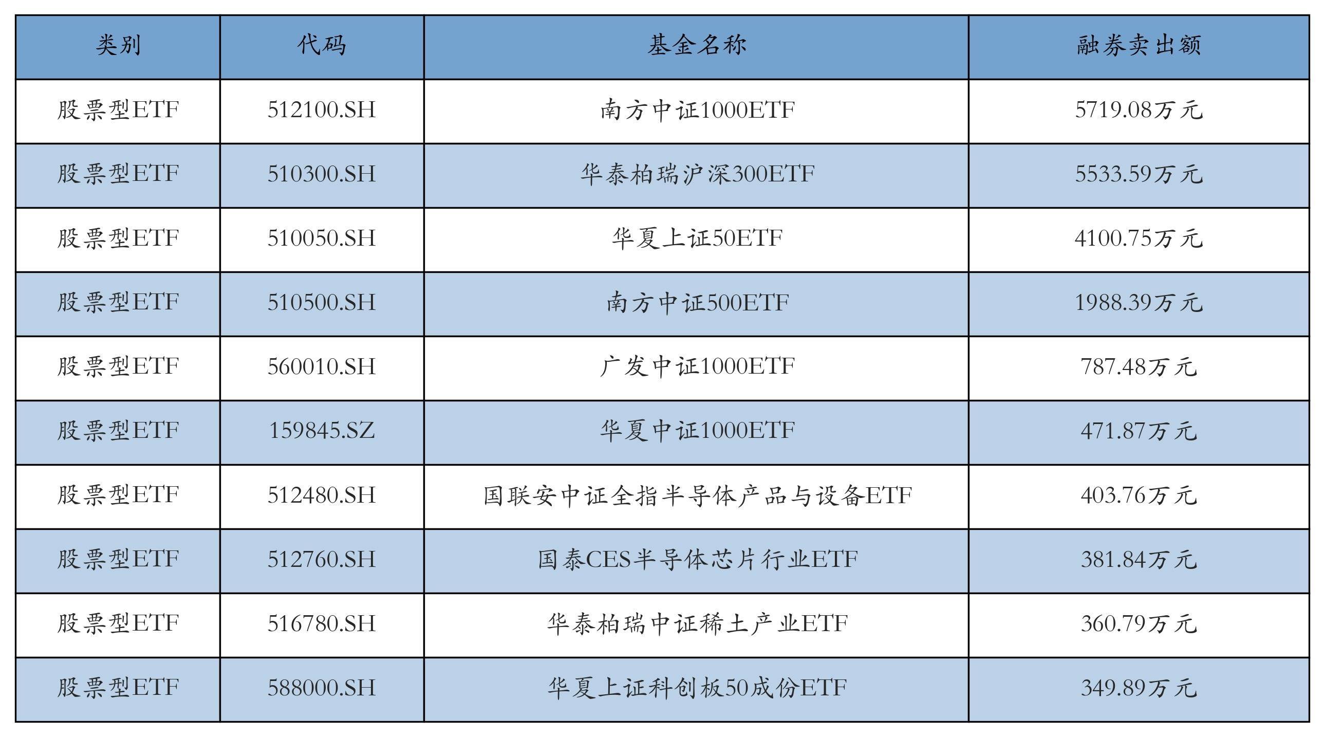 昨日股票型ETF融资卖出额最高的3只ETF及其卖出金额分别为:南方中证1000ETF(5719.08万元)、华泰柏瑞沪深300ETF(5533.59万元)、华夏上证50ETF(4100.75万元)。融券卖出额前10详情见下表:
