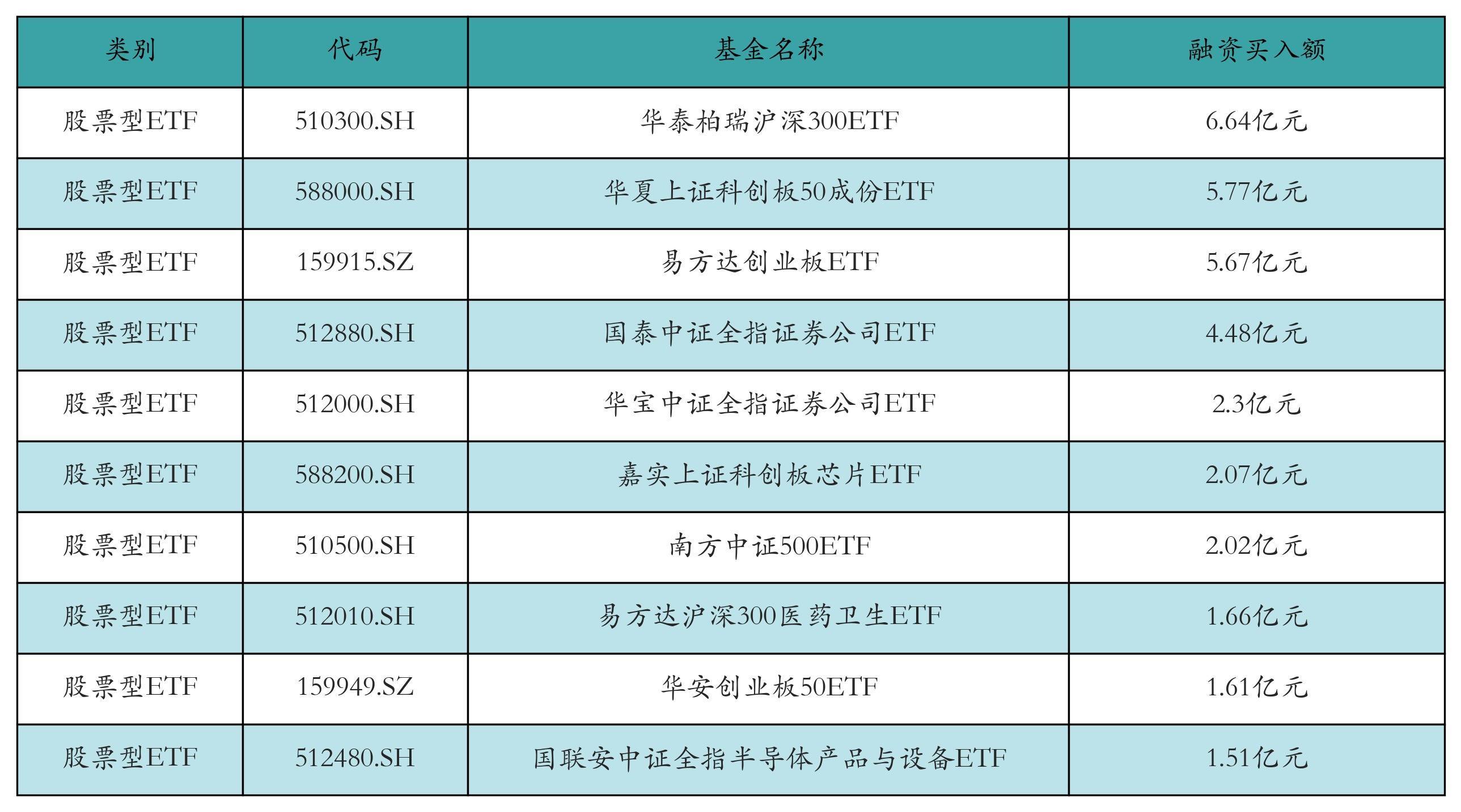 昨日股票型ETF融资买入额最高的3只ETF及其买入金额分别为:华泰柏瑞沪深300ETF(6.64亿元)、华夏上证科创板50成份ETF(5.77亿元)、易方达创业板ETF(5.67亿元)。融资买入额前10详情见下表: